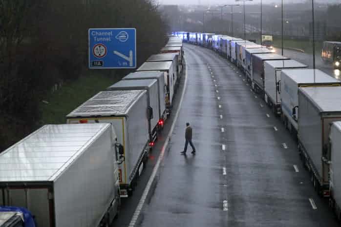 フランス側からイギリスに行くことはできるが、フランスのトラックは、イギリスから戻って来ることができず、ドーバー港周辺には、貨物トラック数百台が止まっている。